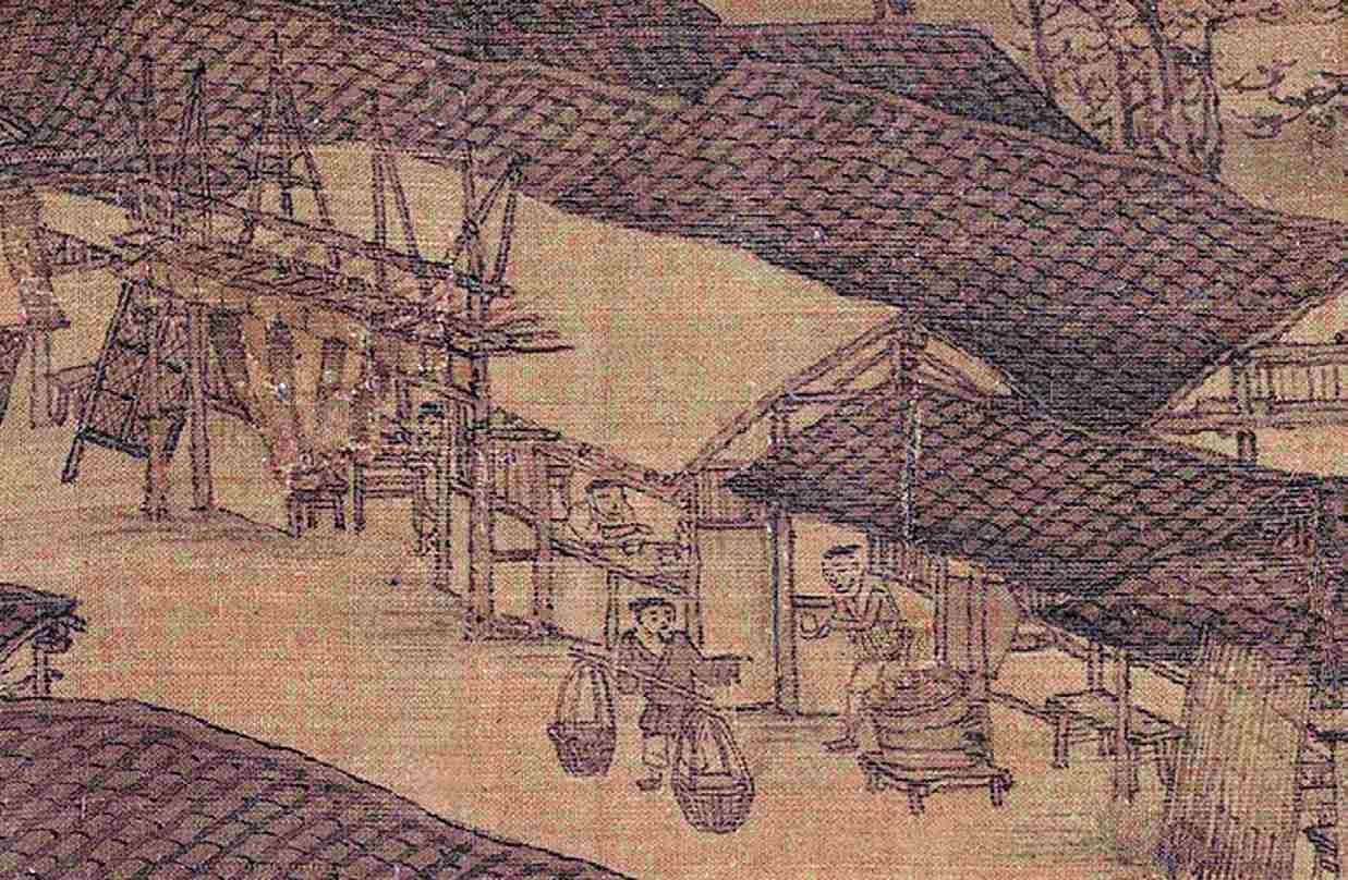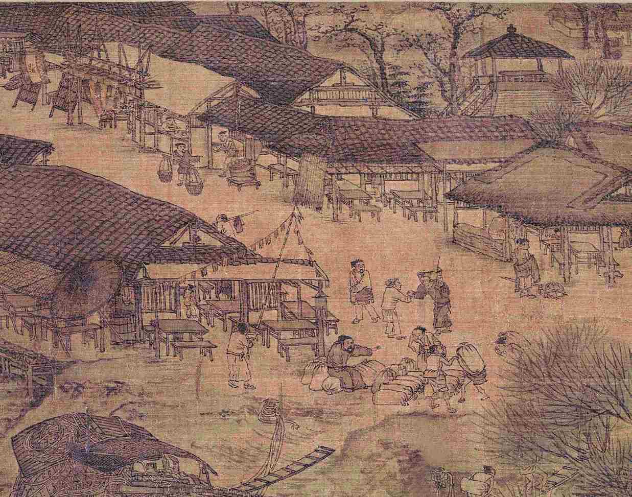 挑着担子的小贩四处游走;酒家老板娘正倚在门边招呼路人;辛苦了一早上的挑夫只舍得在路边买个馒头充饥;扎着幌子的算命先生口若悬河地指点人生;也许是寒食节刚过,饭馆的伙计直到此时才迟迟地撑起旗幡;巷口的王家纸马店正值清明上午出城扫墓的高峰期,应该生意不错,到了盘点清算账目的时候,老板喜上眉梢;码头上的背夫们扛着货物上上下下络绎不绝,工头招呼组织着大伙儿的秩序,而满脸络腮胡子的货主坐在麻袋上清点着货品。