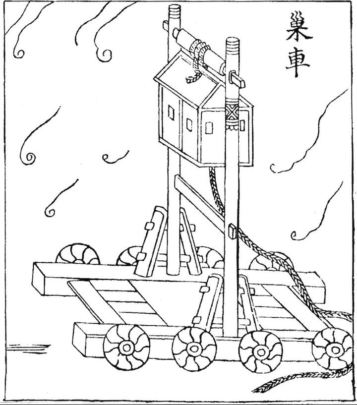 出宋曾公亮《武经总要》。巢车是有瞭望设施的车,历代载籍不乏记述,但其形象,似至《武经总要》方曾一见。