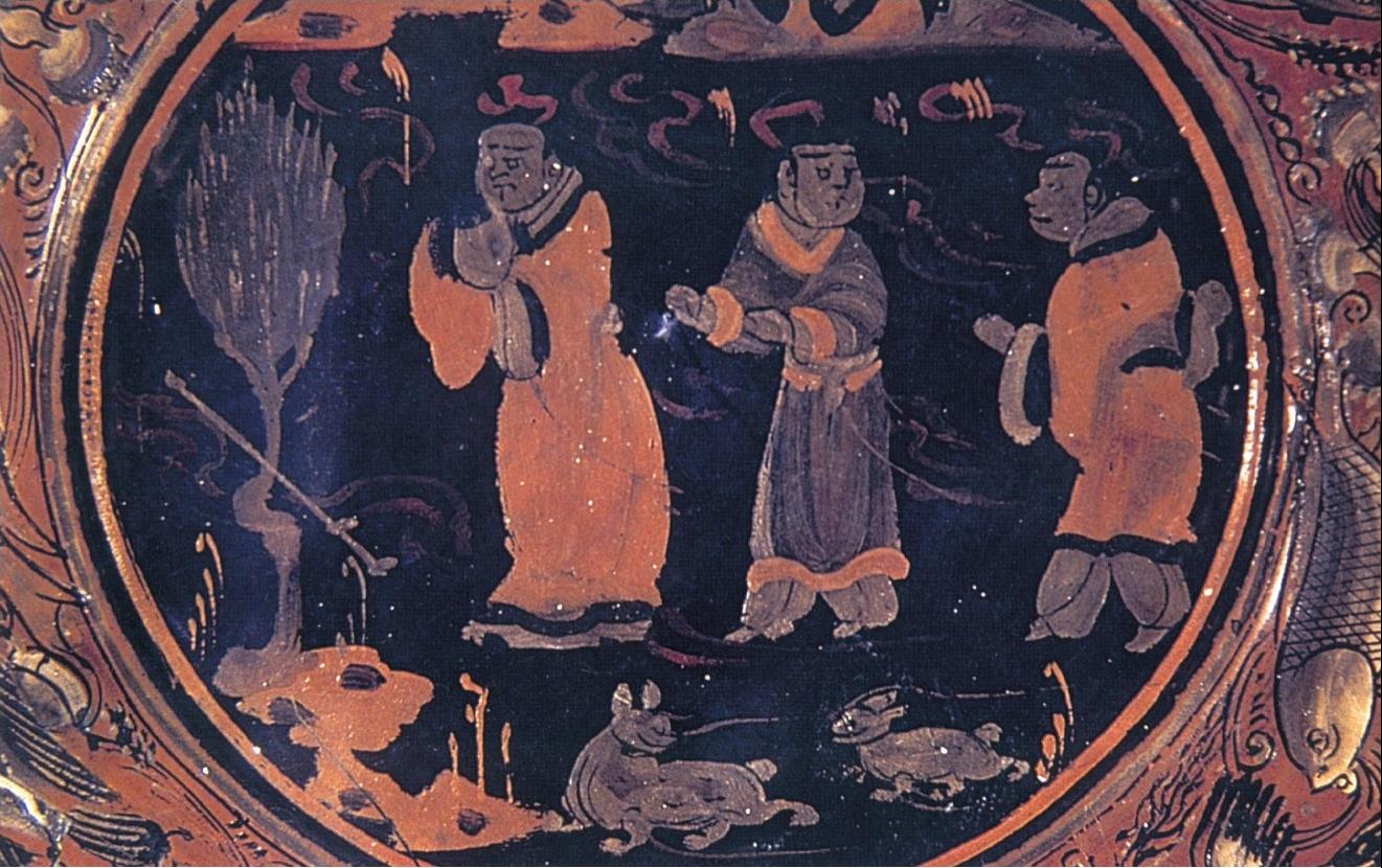 盘中心彩绘季札挂剑徐君冢树的故事,画面左侧为冢边之树,树身悬一剑,树前所立衣红者,便是季札。