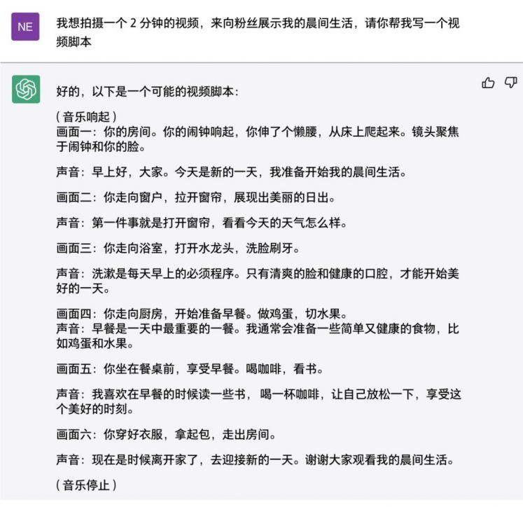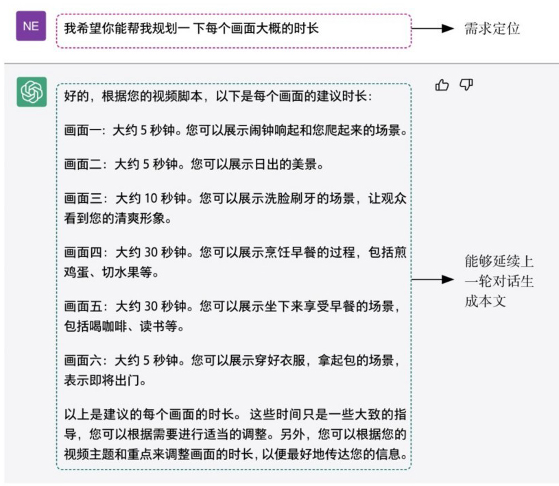 图1.15是一个使用ChatGPT生成视频脚本的例子。在我们对视频内容和总时长提出了具体要求后,ChatGPT很快就生成了一个有分镜头的视频脚本。脚本包含了画面内容及与画面相匹配的文案。