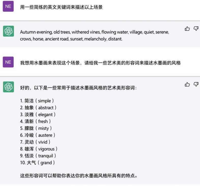 图1.21为ChatGPT生成的结果,可以看出,它能够使用精练的关键词对长文本进行总结,但对水墨画风格的描述还不够完整,我们可以基于它生成的答案给予进一步的引导,以获得更完善且准确的结果。