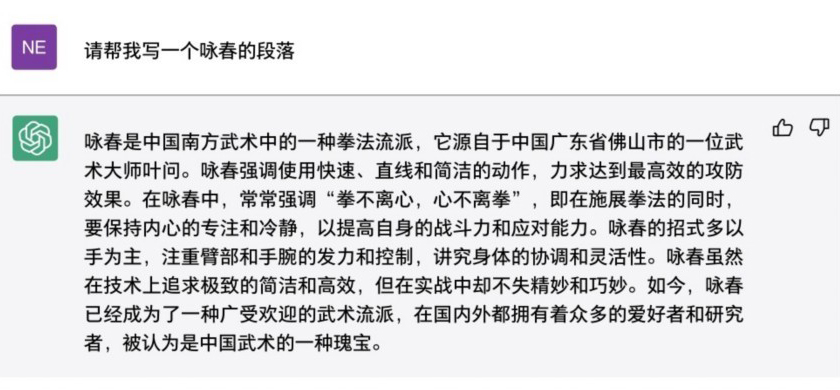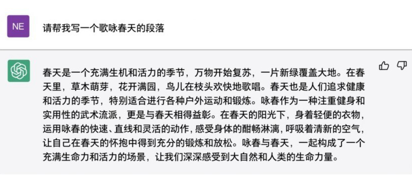 用户向ChatGPT提出“请帮我写一个咏春的段落”,这里的“咏春”既可以表示“歌咏春天”的意思,也可以表示“咏春拳”这种武术招式,而用户的本意是歌咏春天。从回答来看,显然ChatGPT推测用户意图时错误地将“咏春”理解为了武术招式,并对武术招式生成了一段描述性的文本。