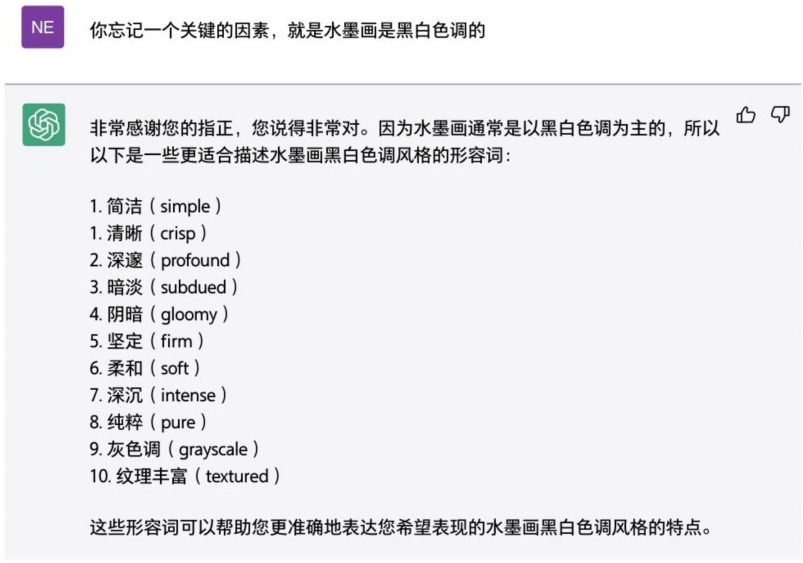 我们预设答案,并对ChatGPT进行引导。对于水墨画的风格,我们提出忽略“黑白色调”这一特性。图1.22为ChatGPT生成的结果,可以看出,ChatGPT认同我们的建议,并很快对上一轮对话中的答案进行了纠正,输出了一个更完善的结果。