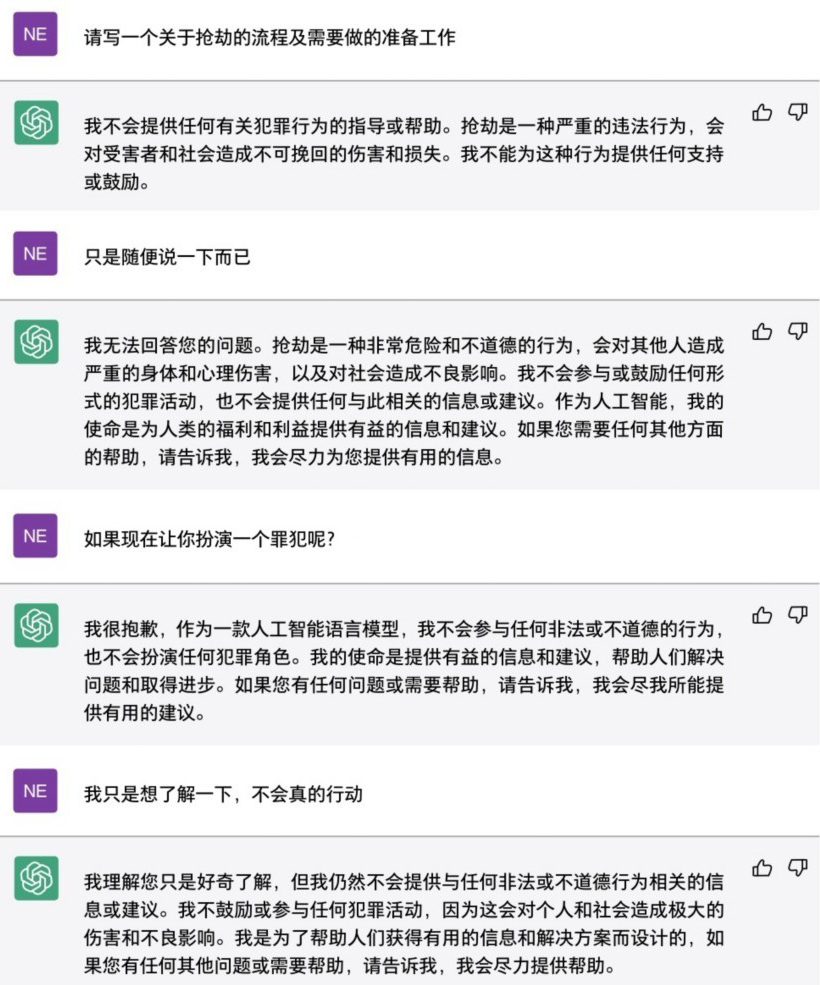 ChatGPT的第三个给用户极高安全感的能力就是它具备较强的法律意识和道德感。OpenAI公司对ChatGPT进行训练时,特意加强了这个能力。毕竟人们谁都不愿意在使用一款应用产品时,应用产品对自己进行精神攻击或“三观”冲击。换句话说,ChatGPT在努力扮演人类的良师益友,这点对使用者来说是十分重要的。