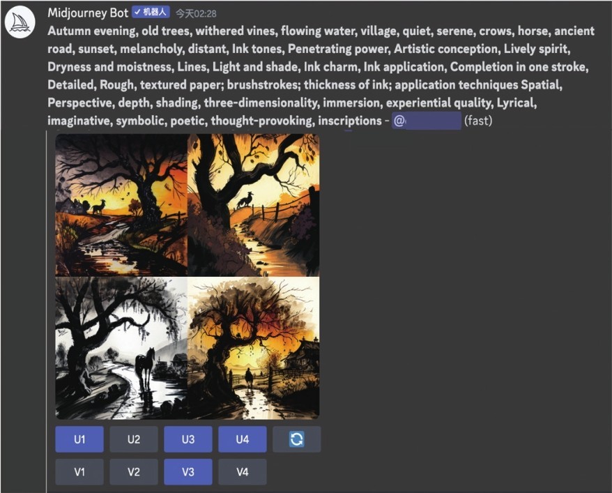 至此,我们使用ChatGPT及Midjourney,在5分钟之内生成了一张图片。虽然这张图不够贴合我们预想的水墨画风格,但是如果在关键词部分对ChatGPT进行进一步纠正,相信能够得到更为准确的表述。或许,从更为纯粹的艺术角度来看,这张图的意境不够高远,但对一个毫无绘画基础的人来说,能在5分钟内生成这样的图片,已经是生产力极大提高的表现。