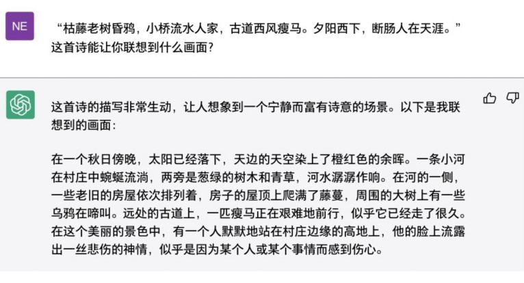 图1.20展示了ChatGPT生成的结果,可以看出,它能够准确理解马致远这首小令所表述的意境。在它描述的画面中,几乎涵盖了这首小令所要传递的意象。