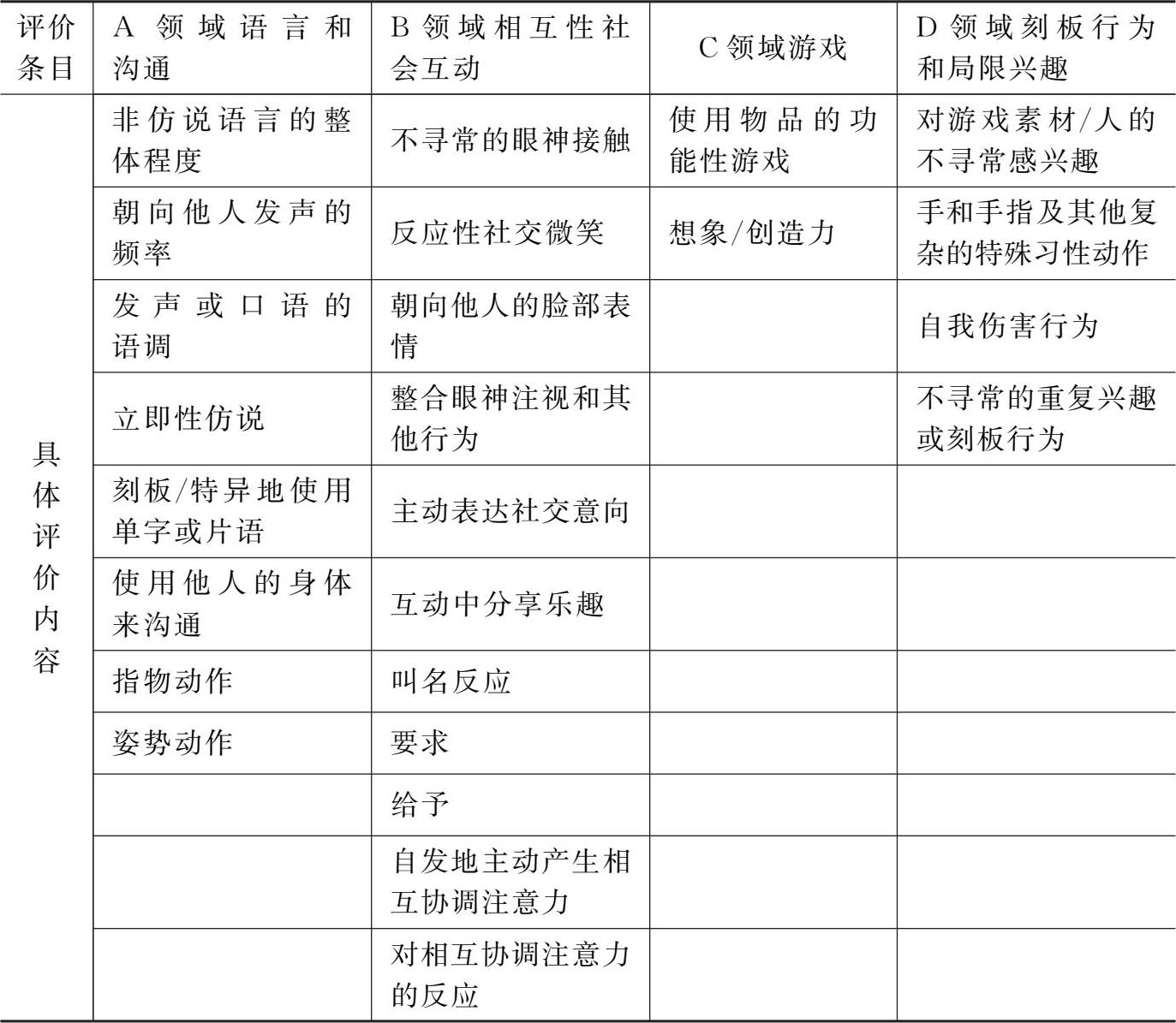 该量表共由15项内容组成,适用于2~15岁儿童,由具有丰富的专业知识和临床经验的专业人员进行评定,因而用该量表进行评定时准确性高,鉴别能力强,可以很好地将自闭症儿童与其他疾病或正常儿童区分开来。模仿能力、语言交流能力、非语言交流能力等这些自闭症儿童核心症状的表现,CARS均有所考量,所以用该量表能够很好地观察自闭症儿童存在的严重问题或程度,见附录3。