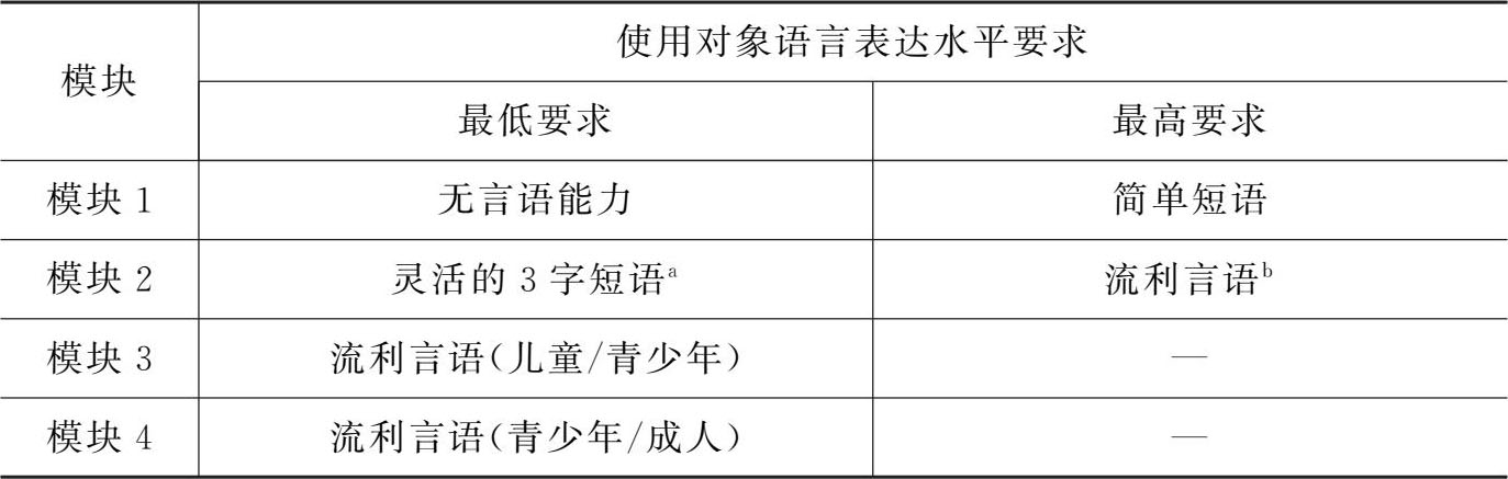表1-2 自闭症诊断观察量表模块使用对象表达语言水平要求