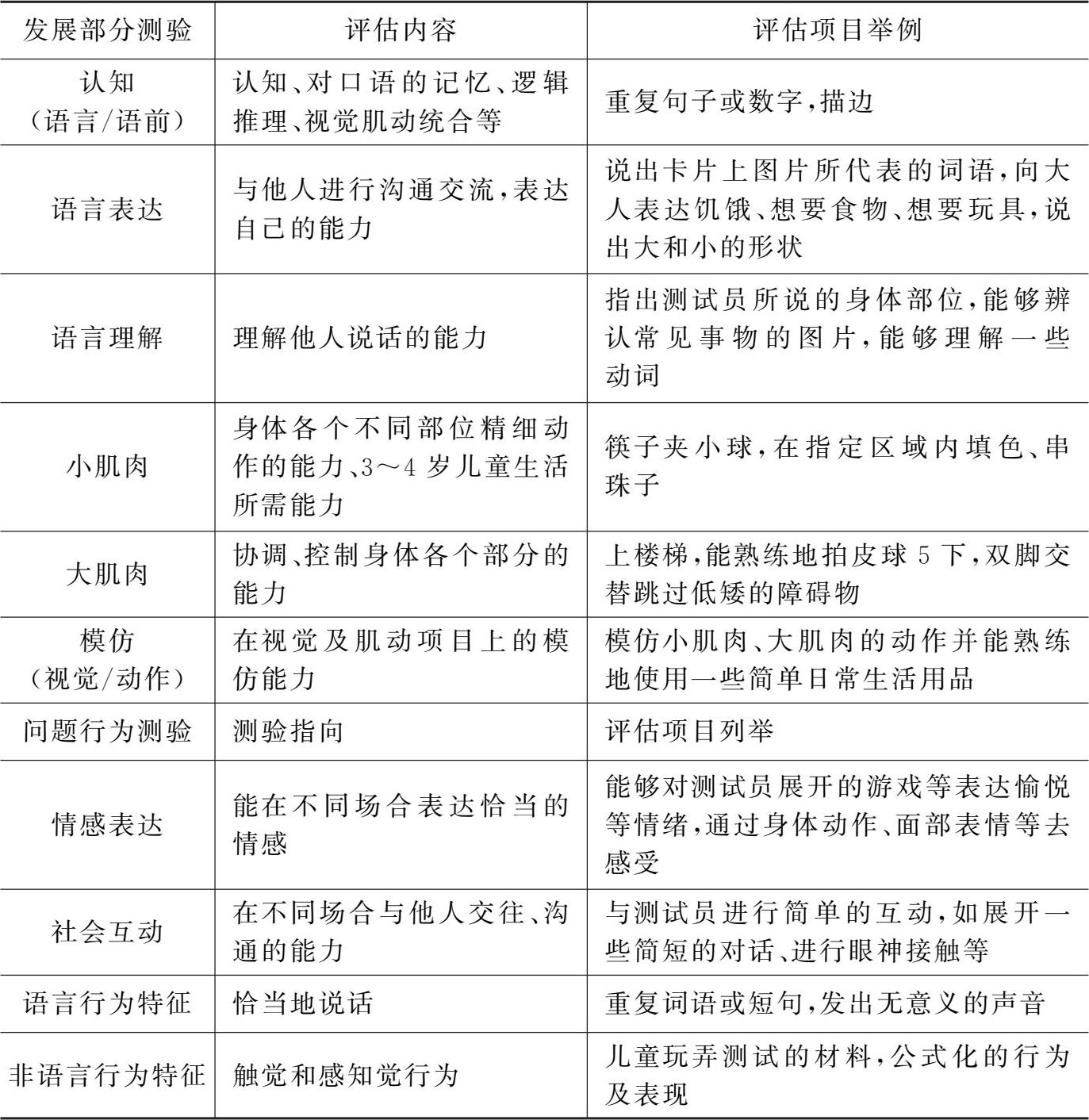 表1-4 PEP-3儿童发展及行为副测验部分评估内容