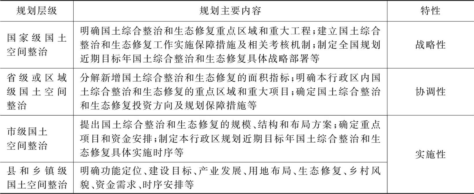 国土空间整治在不同层级规划之中的重点内容与组织形式存在明显的差别,纵向要求规划之间高度契合,横向要求规划能够覆盖各级组织,最终形成立体化的综合整治与生态修复架构。国土空间综合整治与生态修复体系在纵向层面可以分为国家、省、市、县和乡镇(见表3.1)。县级以上地方人民政府应根据当地经济社会发展情况,依据国土空间规划,按照上级土地整治规划确定的目标要求,编制本级土地整治规划,统筹确定本区域各项土地整治活动和年度安排,乡(镇)、村可根据需要,组织编制乡(镇)土地整治规划和村土地利用规划,统筹安排生产、生活、生态用地,整体推进农村土地综合整治。