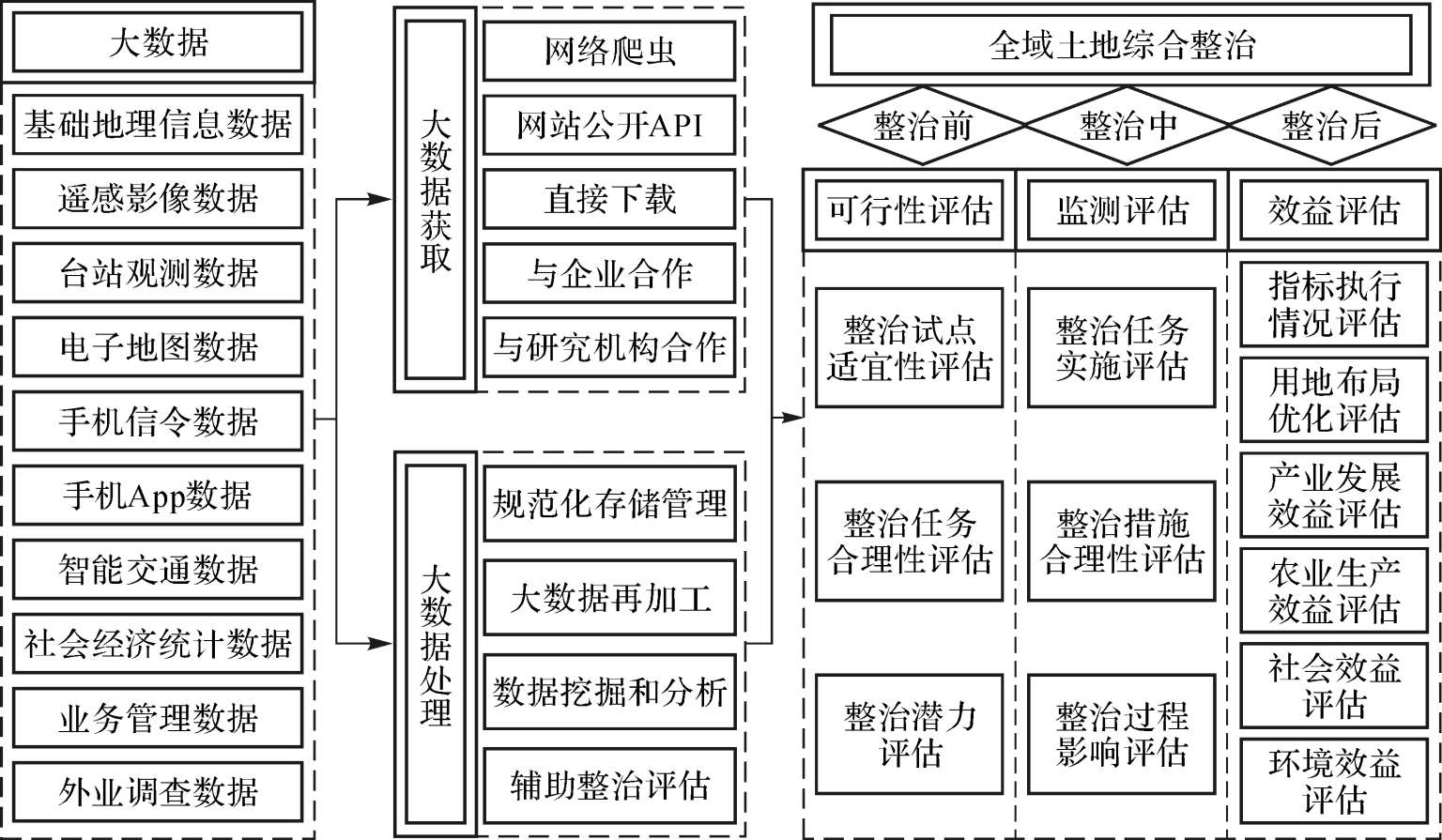 大数据时代的到来,为引导全域国土空间整治从以“用地指标”为核心的静态方案评估向以“要素流动”为核心的动态监测评估转变提供数据和方法支撑。大数据的动态可获取性,有助于实现对国土空间整治区域的动态监测与评估,通过实时采集区域土地利用、基础设施、主体活动、企业生产、生态环境等要素的信息,实时掌握整治区域工程实施和建设的动态情况。各种传感器、手机信令、应用程序、电子地图、社交网络、智能交通等集合而成的大数据均提供了反映土地利用实体和个体行为的时空信息,这些信息现势性强、互动性高,能够更好地实时掌握整治区域土地利用现状、居民时空行为、产业配置与发展等,促进国土空间综合整治评估从以传统数据为支撑的片面性评估走向以大数据为支撑的综合性评估。