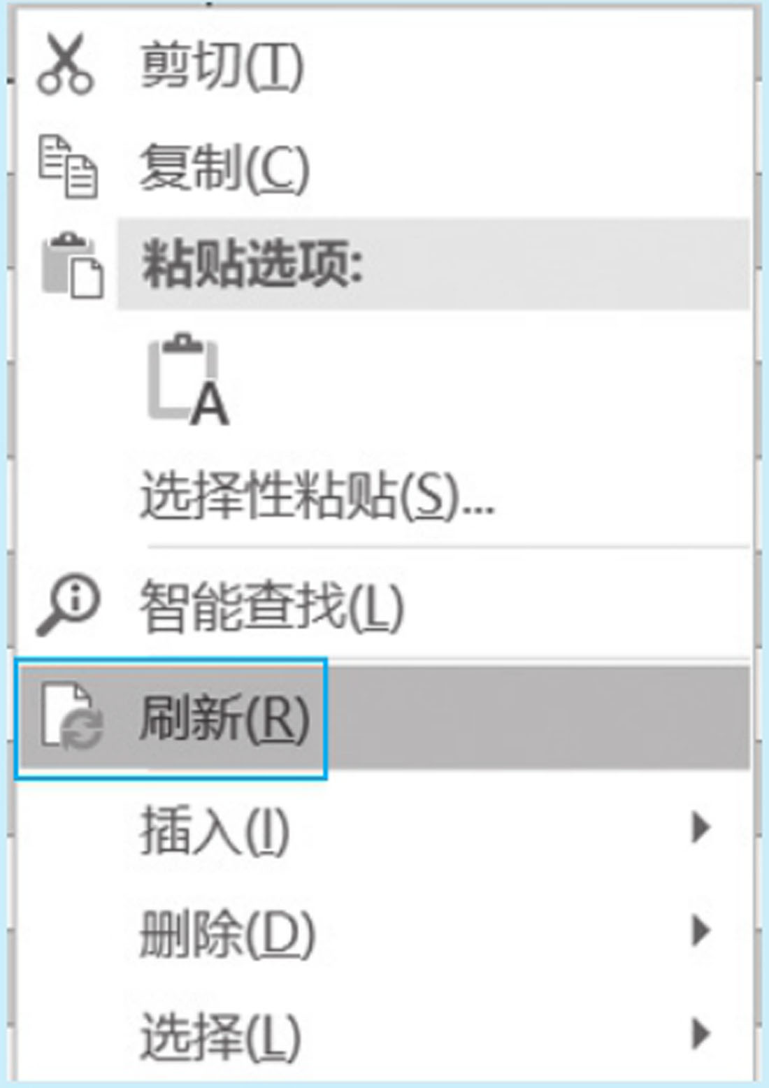 现有连接+SQL方法汇总工作表,既可以是当前工作簿的N个工作表,也可以是其他工作簿的N个工作表(不打开工作簿就可以汇总),而且得到的汇总表是与数据源动态链接的,只要在汇总数据区域内右击,在弹出的快捷菜单中执行“刷新”命令,如图2-43所示,就可以对汇总结果进行更新。