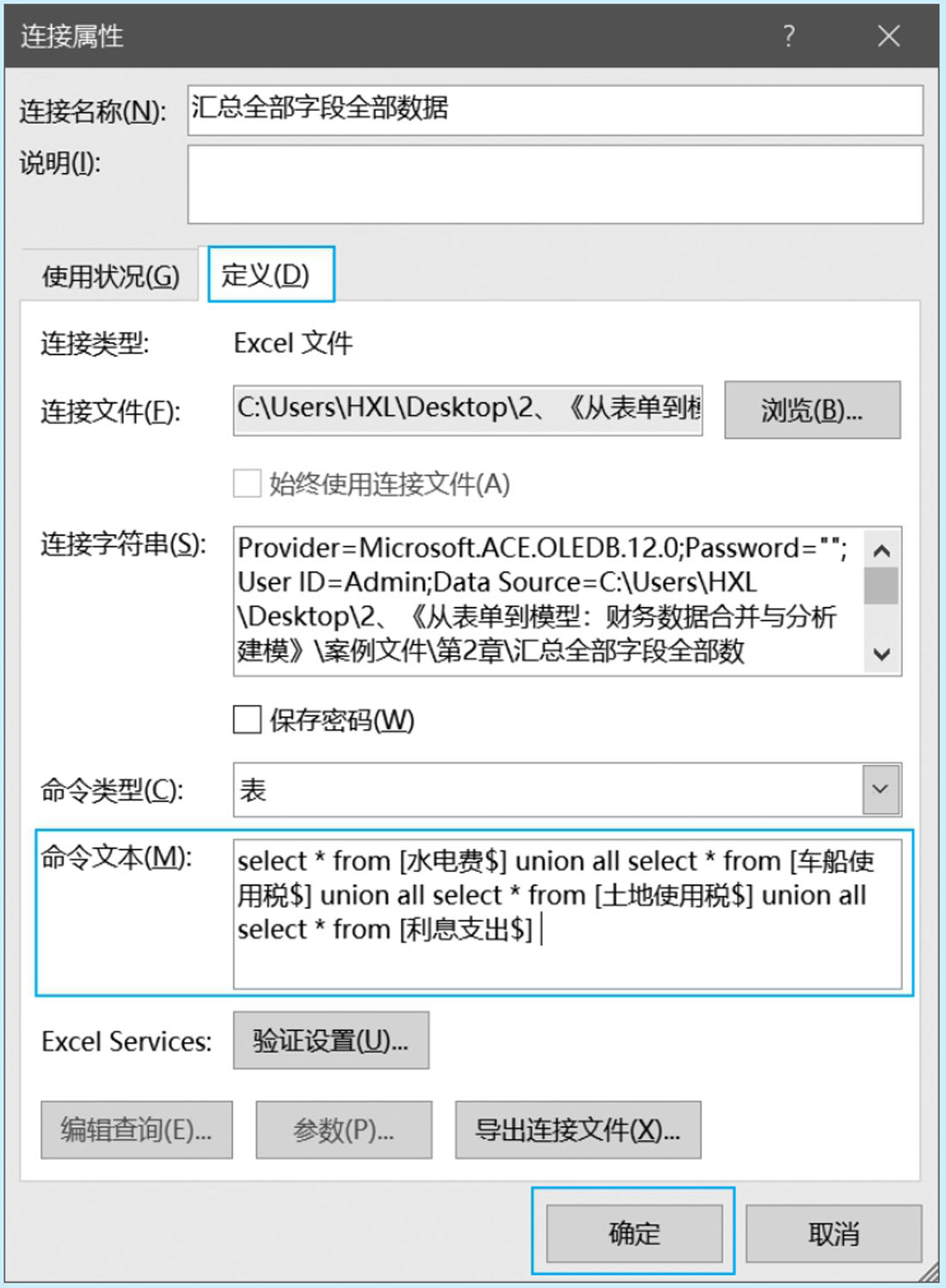 步骤7 切换到“定义”选项卡,然后在命令文本框中输入下面的SQL语句,如图2-33所示。