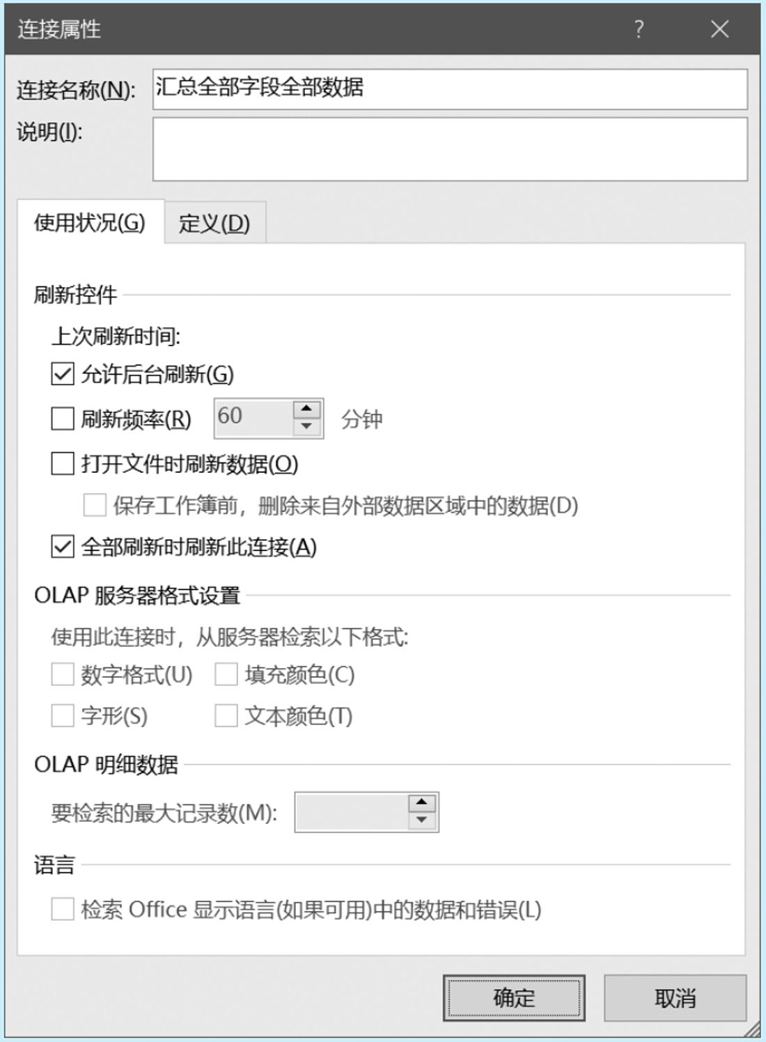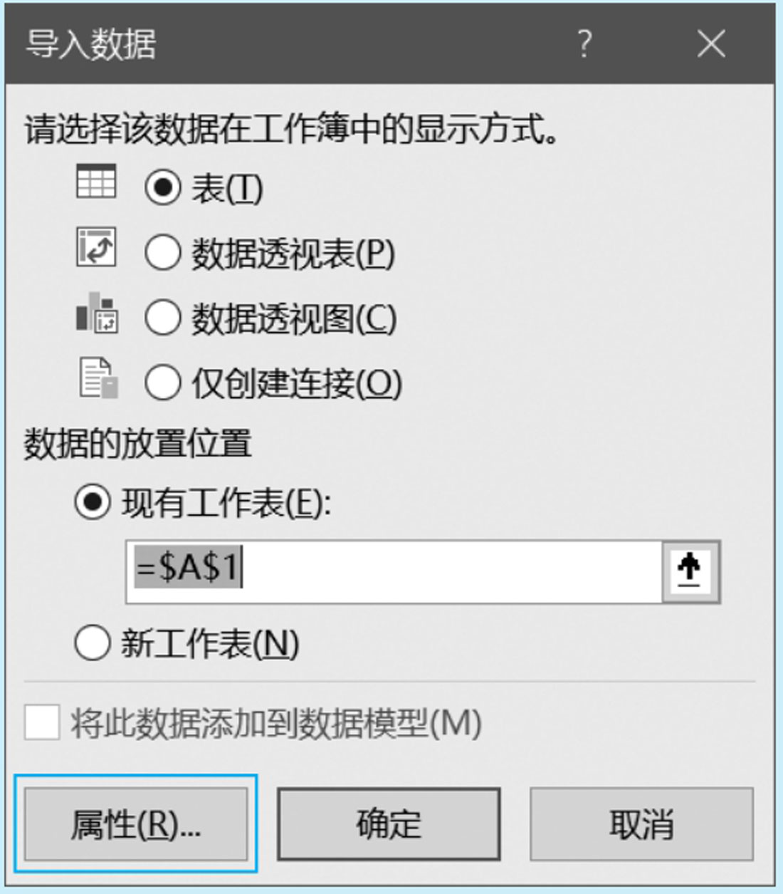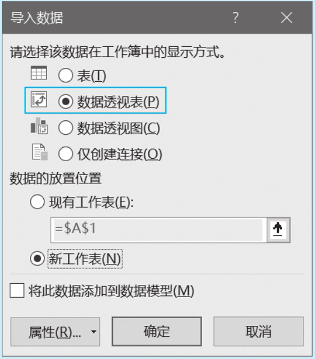 现有连接+SQL语句方法中,在最后一步的“导入数据”对话框中,可以选择“数据透视表”选项,如图2-44所示,这样得到的就是一个数据透视表,而不是一个数据明细表,因此可以创建数据合并与透视分析于一体的自动化数据分析模板。