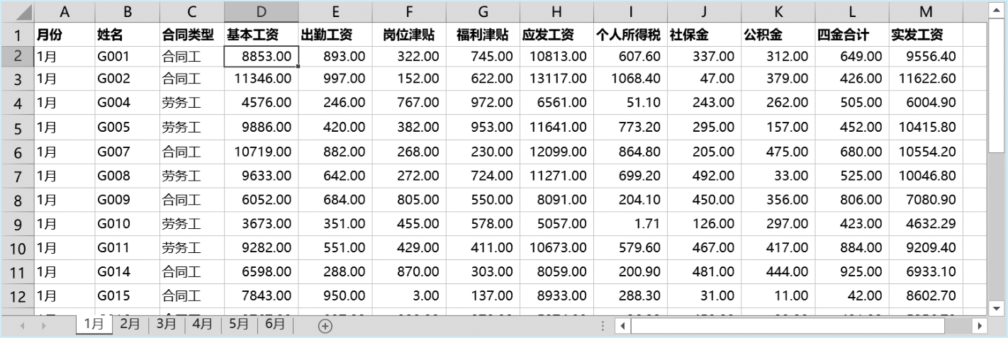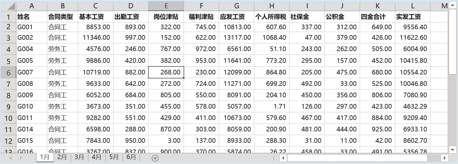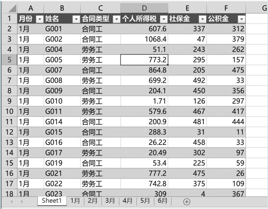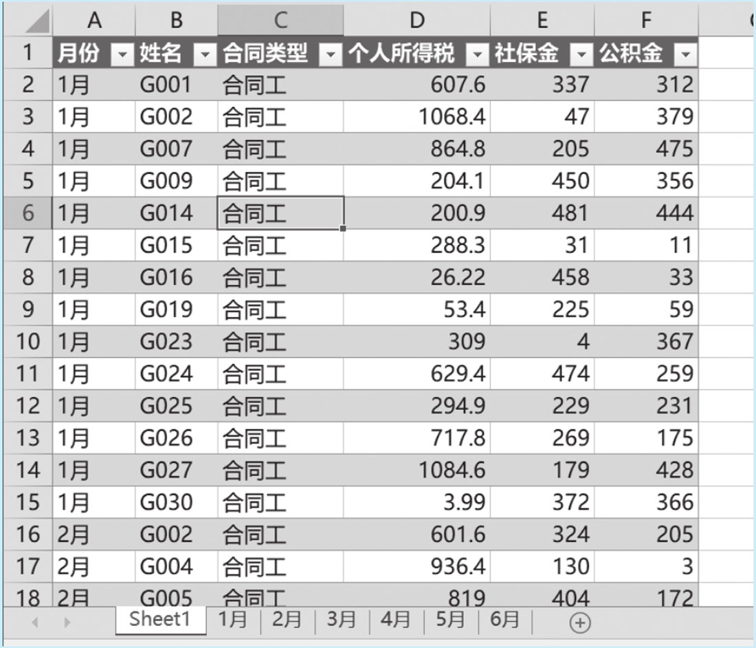 图2-38的示例数据是6个月的工资表中,要求将每个人的个税、社保和公积金合并到一个工作表。