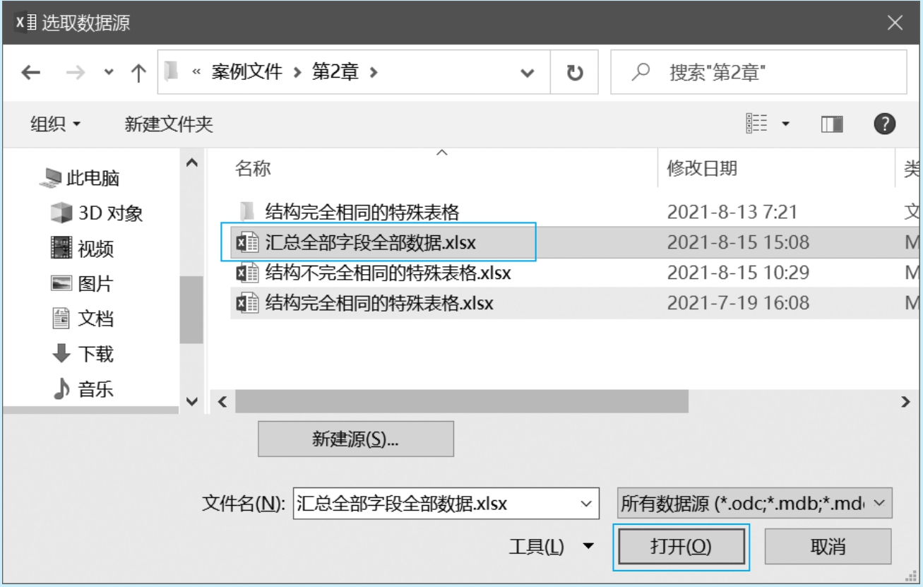 步骤3 单击对话框左下角的“浏览更多”按钮,打开“选取数据源”对话框,从文件夹中选择要汇总的工作簿,如图2-29所示。