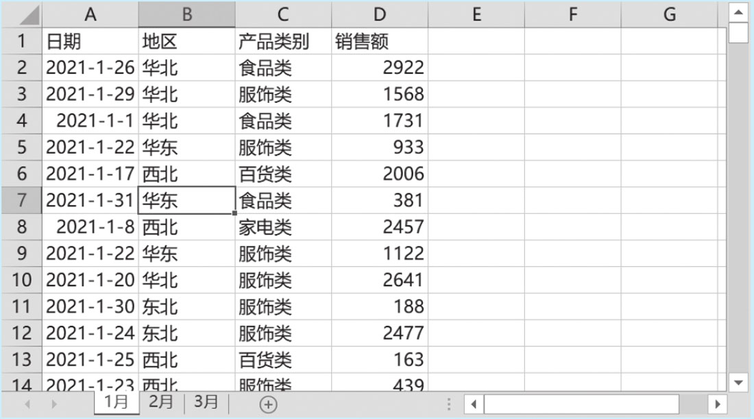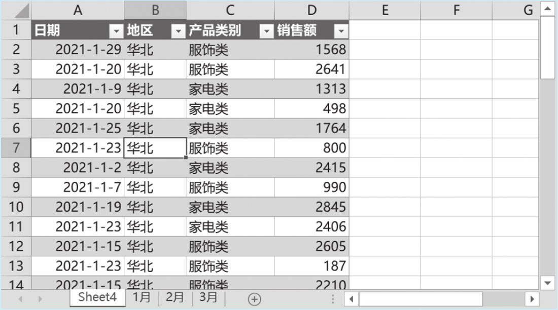 图2-36中的示例要求汇总各月数据到一个表中,地区条件是华北,产品类别是家电类和服饰类。