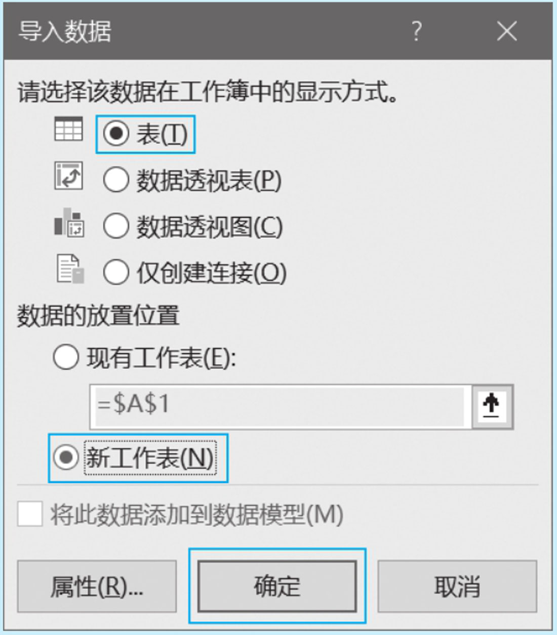 步骤8 单击“确定”按钮,返回“导入数据”对话框,选中“表”和“新工作表”单选按钮,如图2-34所示。