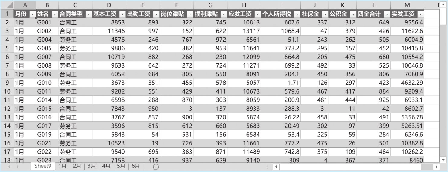 如果要汇总部分字段的部分满足条件的数据,可以在SQL中添加where子句。例如,在上面的例子中,要把合同工各月的社保和公积金汇总到一张表上,SQL语句如下:
