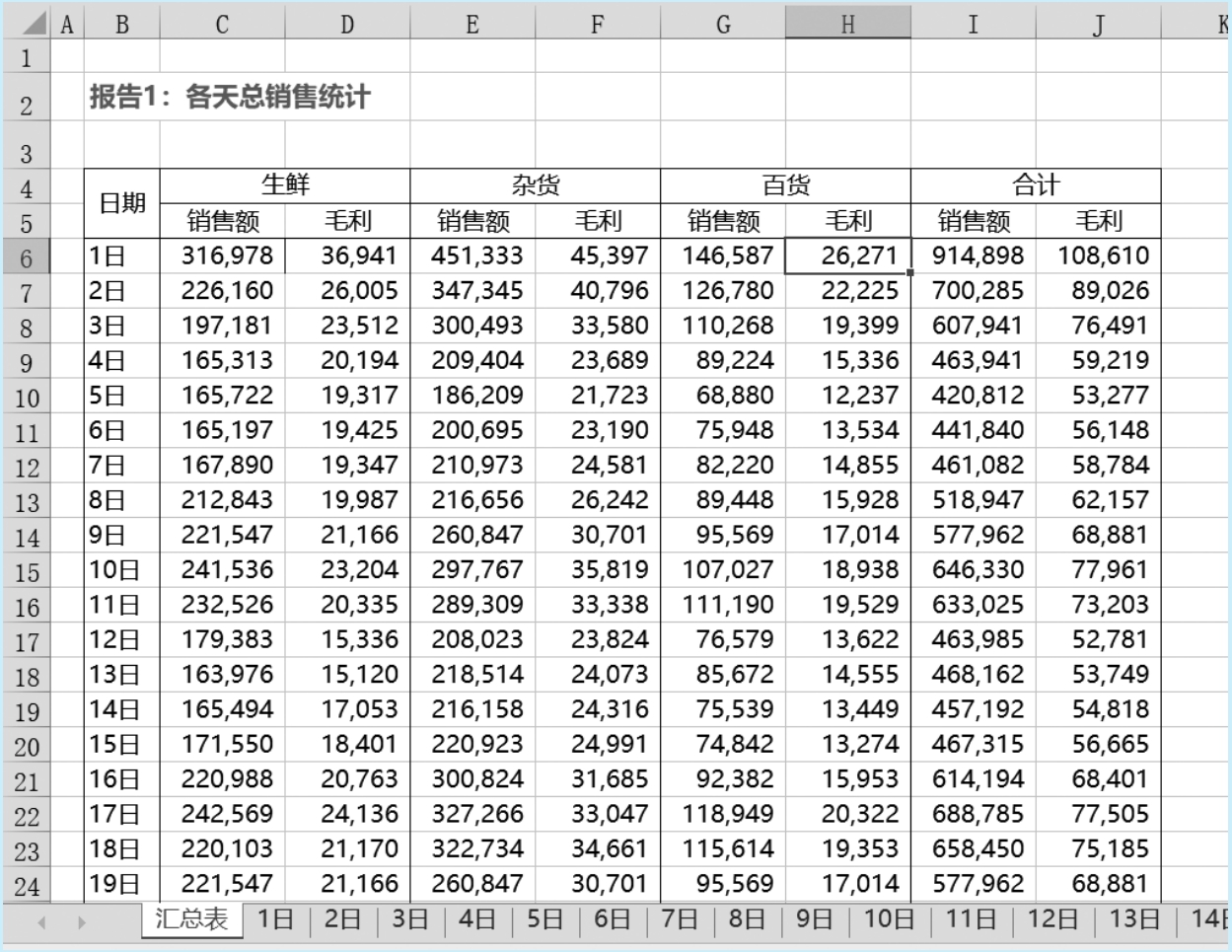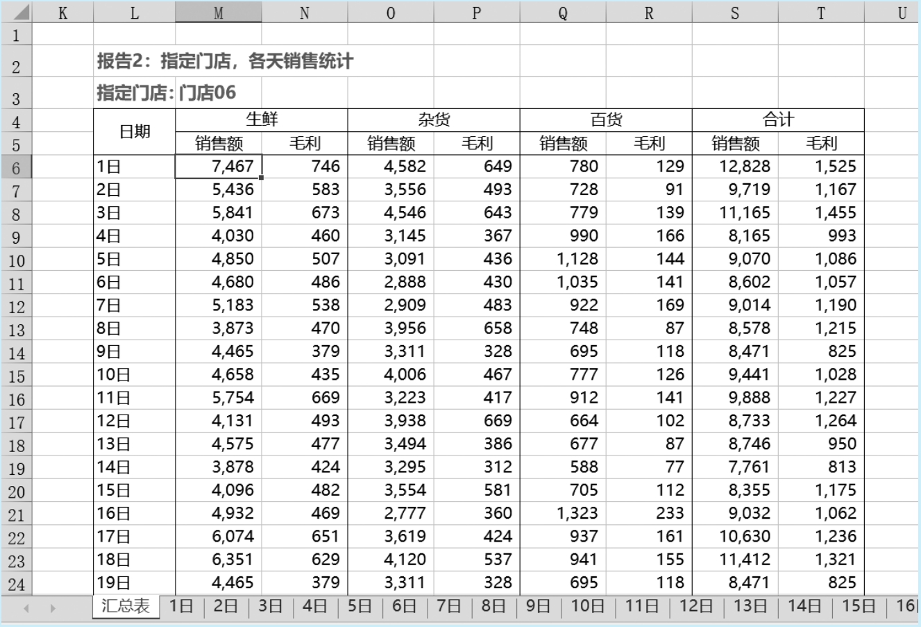 第一个报告是从每天的工作表中查找底部的合计数,由于每个工作表的底部合计数在相同行,因此直接引用即可,也可以使用VLOOKUP函数提取合计数。