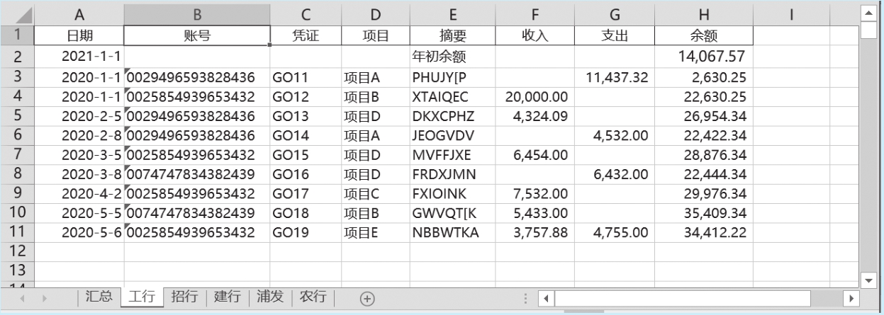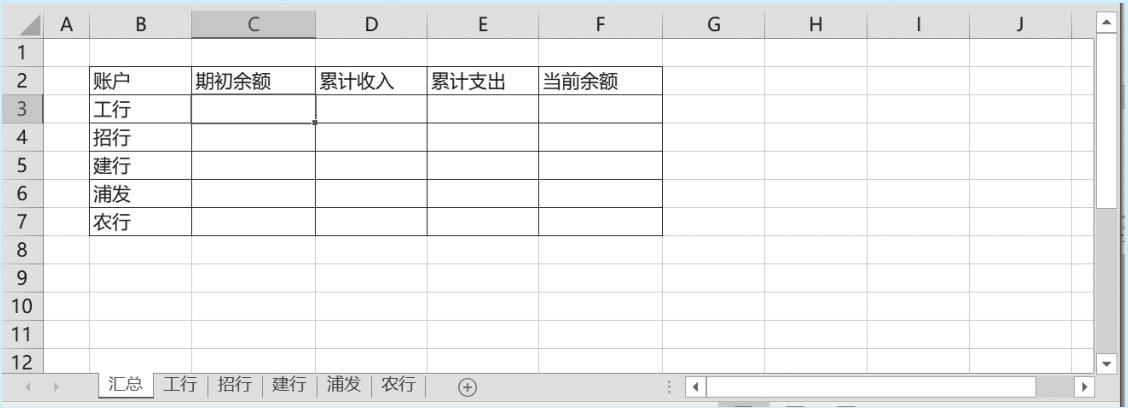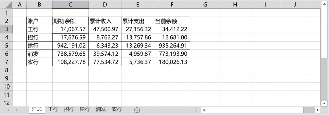 图2-66是各银行账户的日记账,现在要求制作每个银行账户的累计收入、累计支出和当前余额,如图2-67所示。