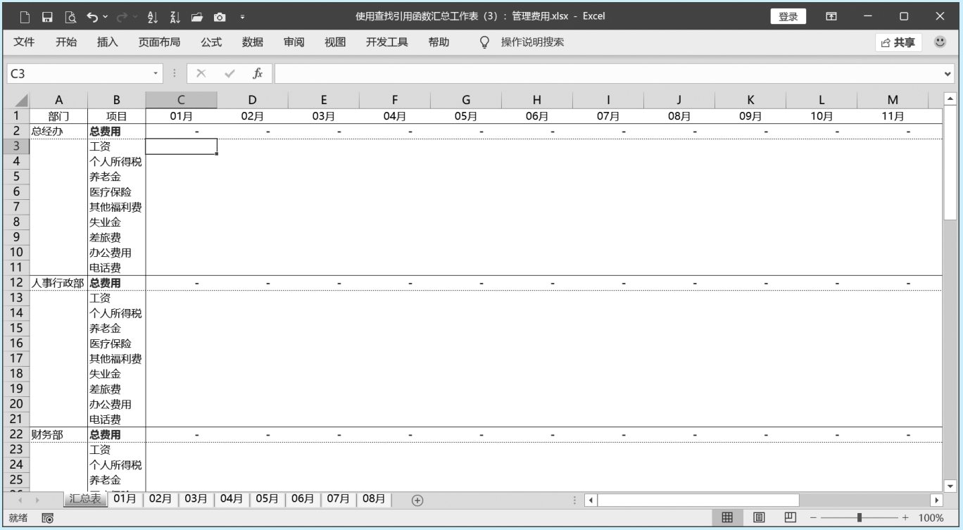 不过,针对此例子,每月数据表的费用项目下面都是7个部门,因此可以使用OFFSET引用每项费用的数据区域,再用VLOOKUP函数提取数据。
