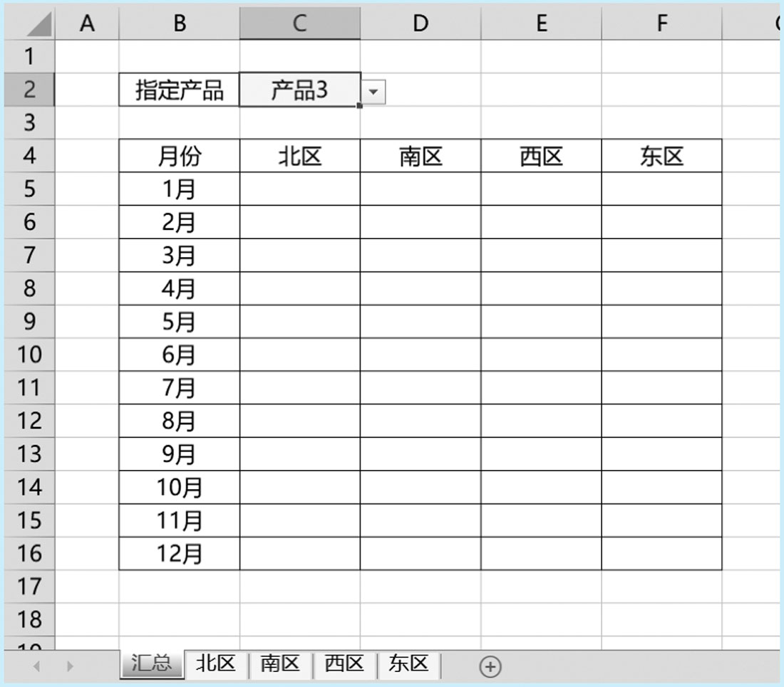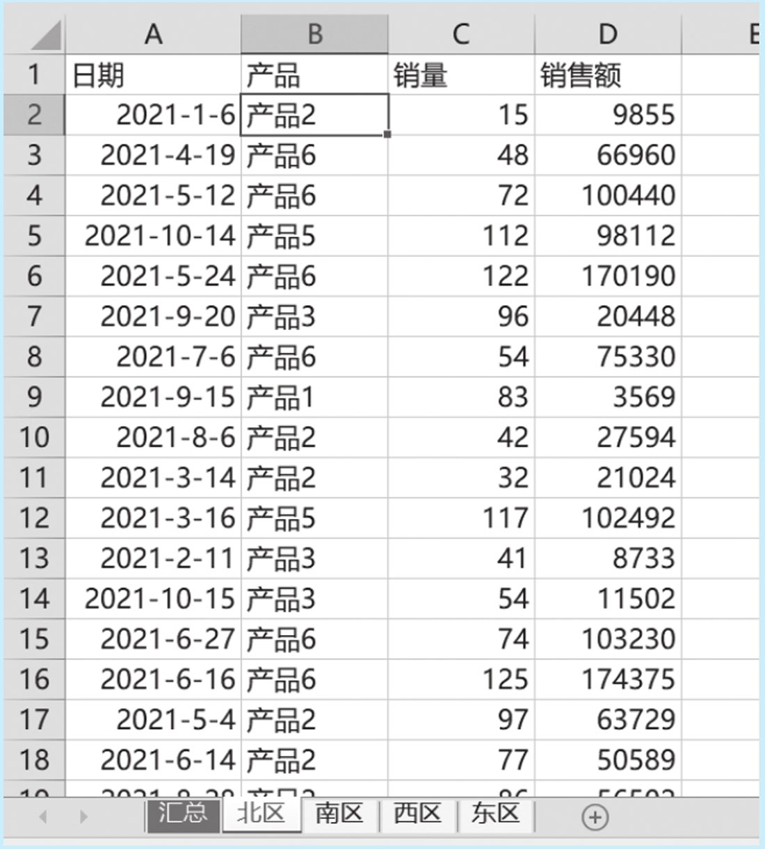 图2-75是各地区的销售明细,现在要求制作如图2-76所示的汇总表,用来查看指定产品在各地区、各月的销售量。