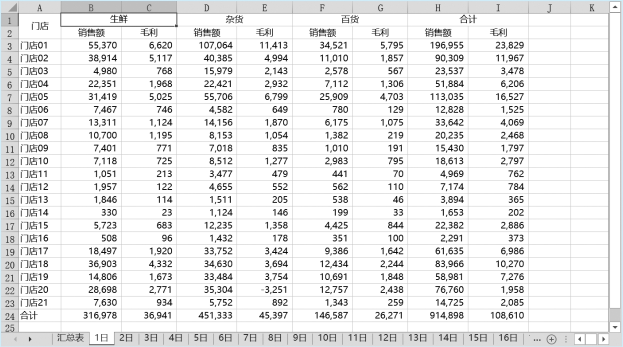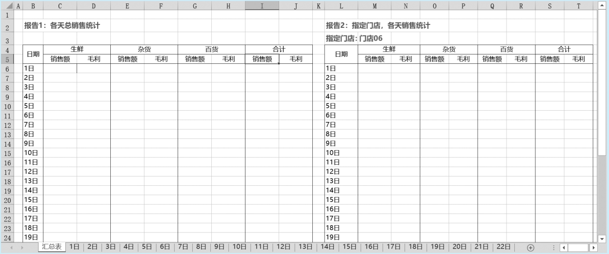 图2-69是另一个例子,也需要使用查找引用函数进行汇总。各门店每天的销售日报表,要求制作两个汇总报告,如图2-70所示。