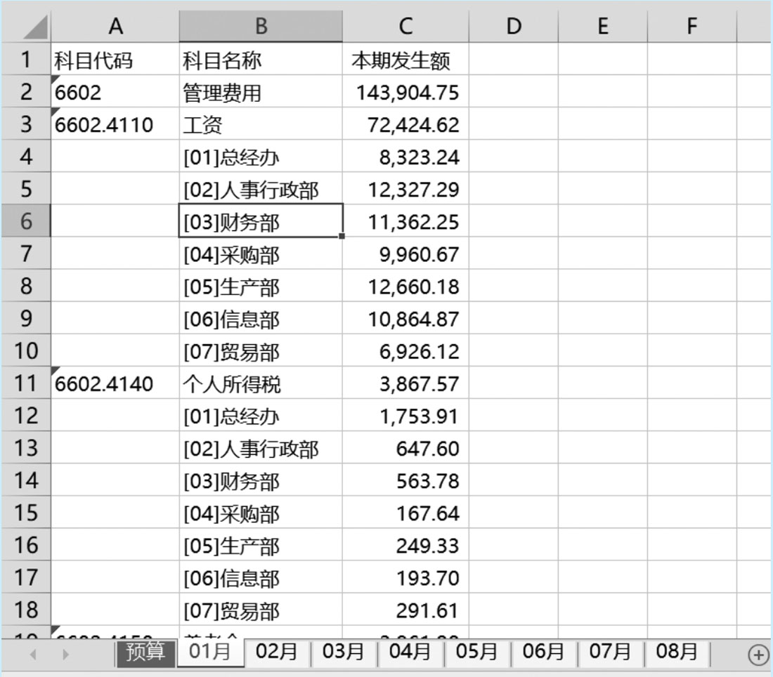 图2-73是一个比较复杂的例子,原始数据是从系统导出的管理费用表,现在要求制作如图2-74所示的汇总表。