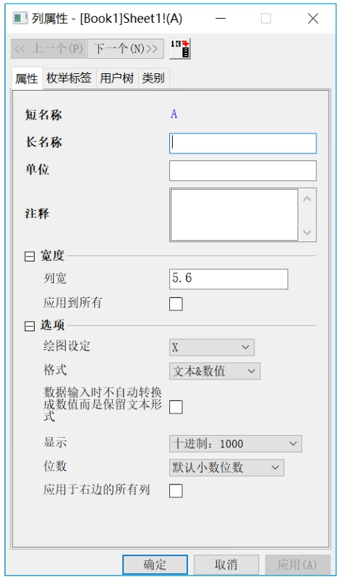 双击数据列的标题栏可以打开如图1-23所示的“列属性”对话框,通过改变参数设置,可以在表头加入名称、单位、注释或其他特性。