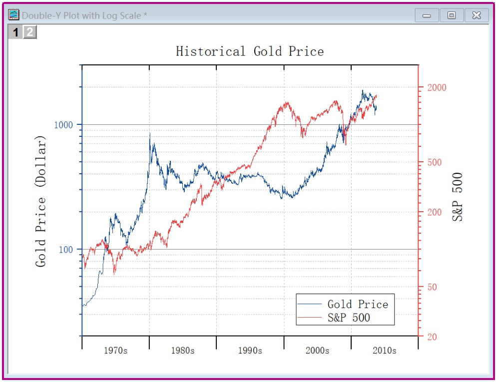 一个图形窗口由一个或者多个图层组成,默认的图形窗口拥有第1个图层。每一个图形窗口都对应着一个可编辑的页面,可包含多个图层、多个轴、注释及数据标注等图形对象。如图1-24所示为一个具有2个图层的典型图形窗口。作图过程分为先选中数据后执行作图命令,或先执行作图命令后选择数据两种绘图方式。