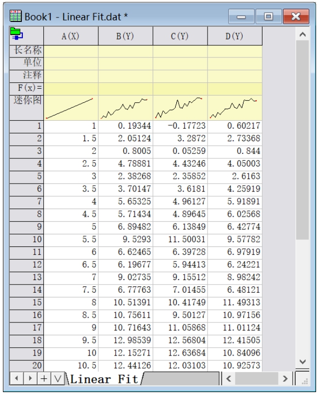 工作簿中存放数据的表格称为工作表,工作表窗口最上边一行为标题栏,A、B等是数据列的名称,X和Y是数据列的属性,其中,X表示该列的自变量,Y表示该列的因变量。