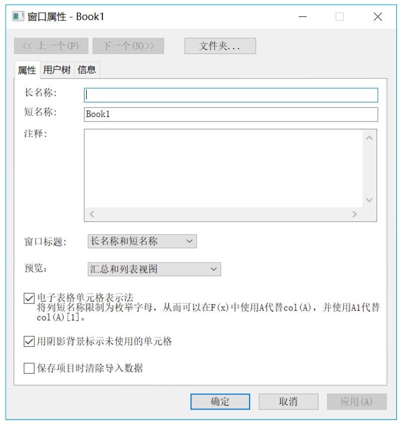 首次启动Origin后看到的第一个窗口就是工作簿窗口,如图1-21所示。默认的工作簿标题是Book1,在标题栏中右击,在弹出的快捷菜单中选择“属性”命令,此时会弹出“窗口属性”对话框,在该对话框中可以修改窗口的名称,如图1-22所示。