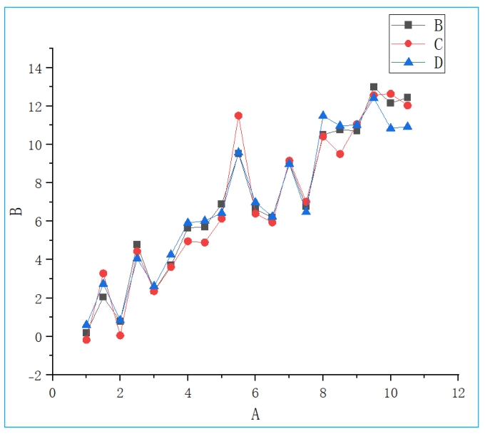 步骤03 单击“确定”按钮生成图形。由于有1个X值,3个Y值,因此得到的图中有3条曲线,如图1-28所示。