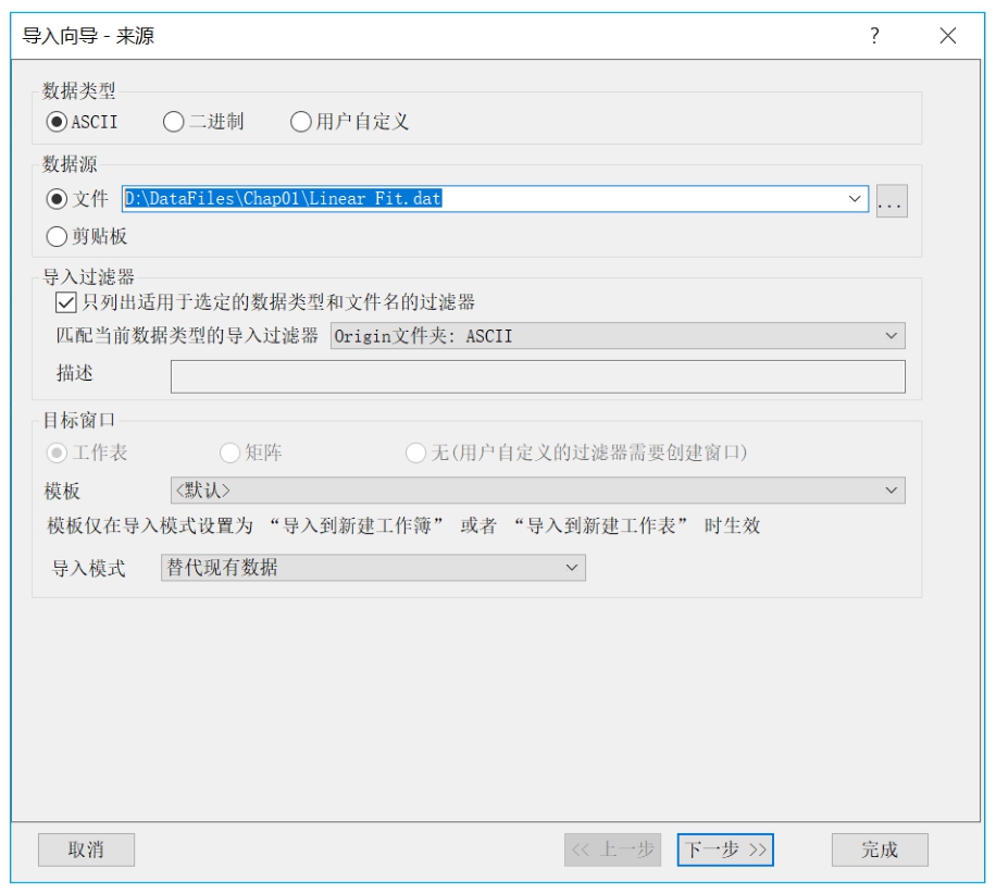步骤01 进入Origin后,执行菜单栏中的“数据”→“从文件导入”→“导入向导”命令,在弹出的“导入向导-来源”对话框中选择要导入的数据文件Linear Fit.dat,如图1-25所示。