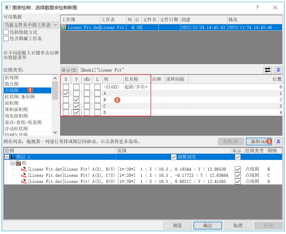 步骤01 使用上面的工作表数据,在未选中数据的情况下,直接执行菜单栏中的“绘图”→“基础2D图”→“点线图”命令,此时弹出“图表绘制:选择数据来绘制新图”对话框。