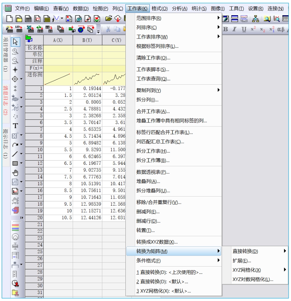 在Origin中可以将工作表转换为矩阵表,当工作表被激活时,执行菜单栏中“工作表”→“转换为矩阵”下的子菜单命令即可,如图1-30所示。