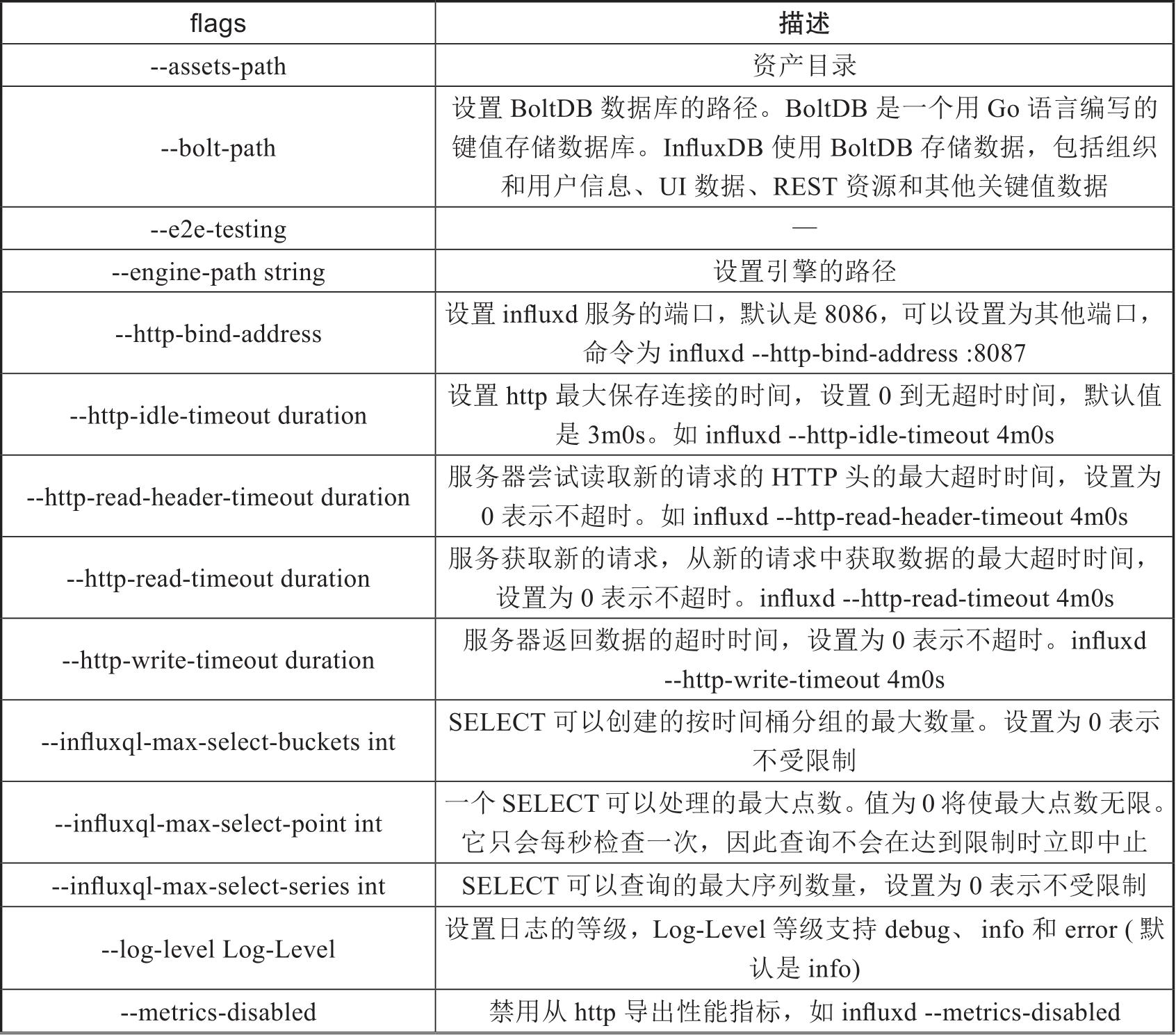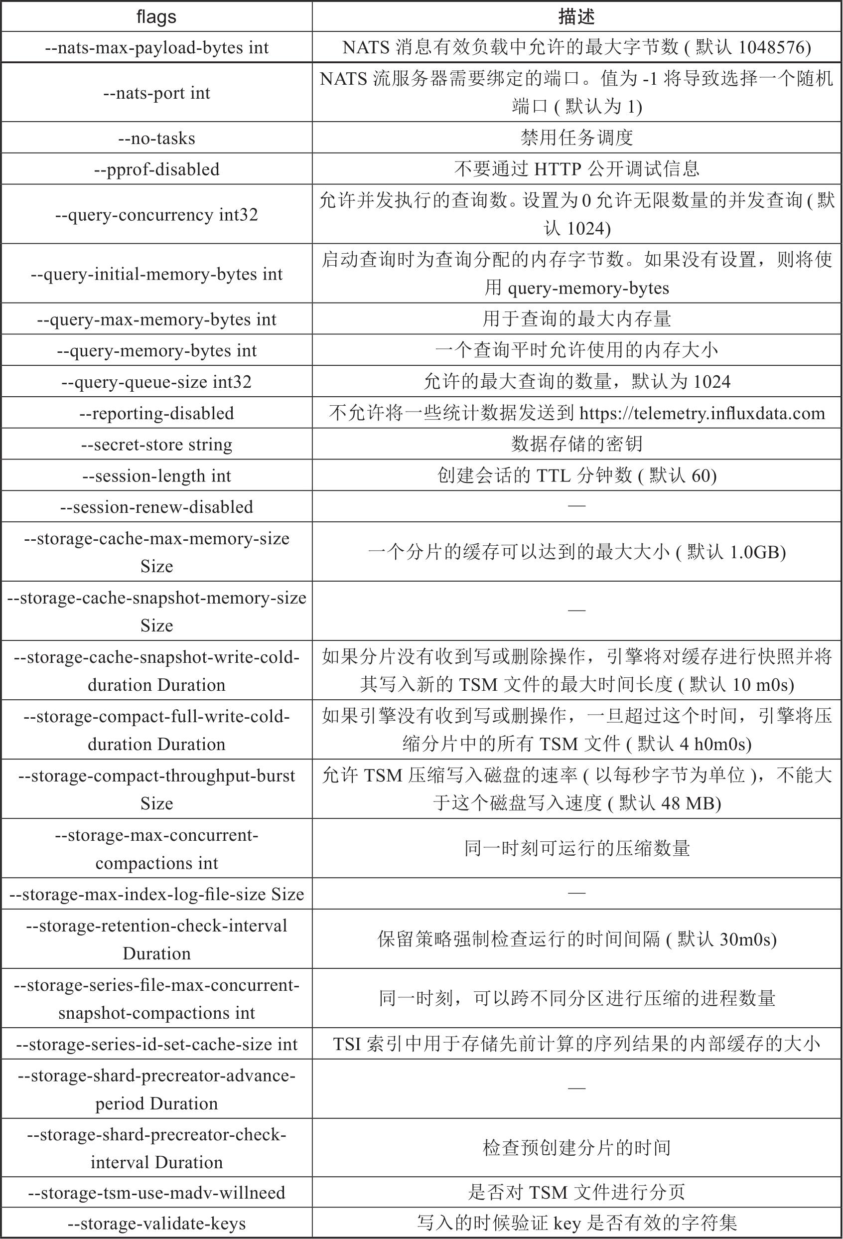 influxd的flags标志主要用于设置一些influxd的变量,flags的功能非常丰富,有多个变量,如表2-3所示。