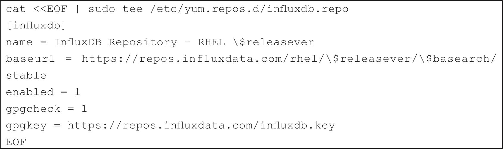 在RedHat & CentOS系统中,可以通过yum命令安装InfluxDB。为了让yum能找到最新的InfluxDB程序,需要将yum软件源添加到RedHat & CentOS系统中,如代码清单2-15所示。