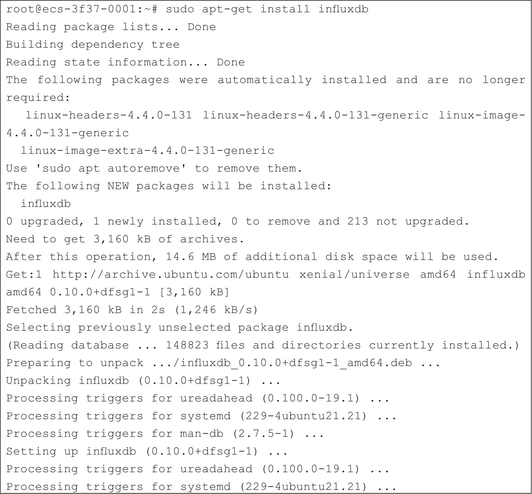 安装InfluxDB服务,如代码清单2-13所示。