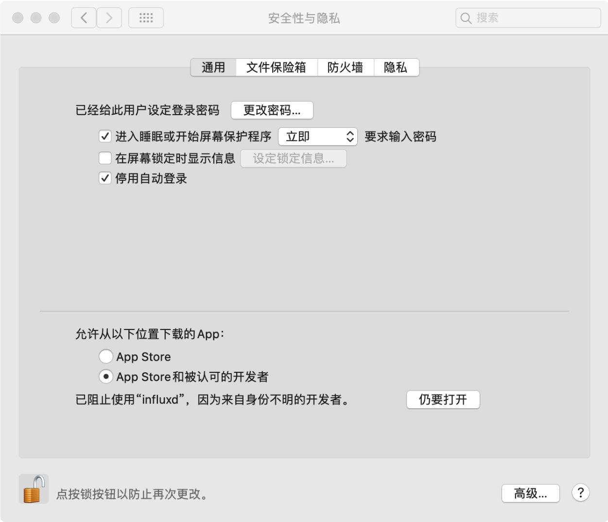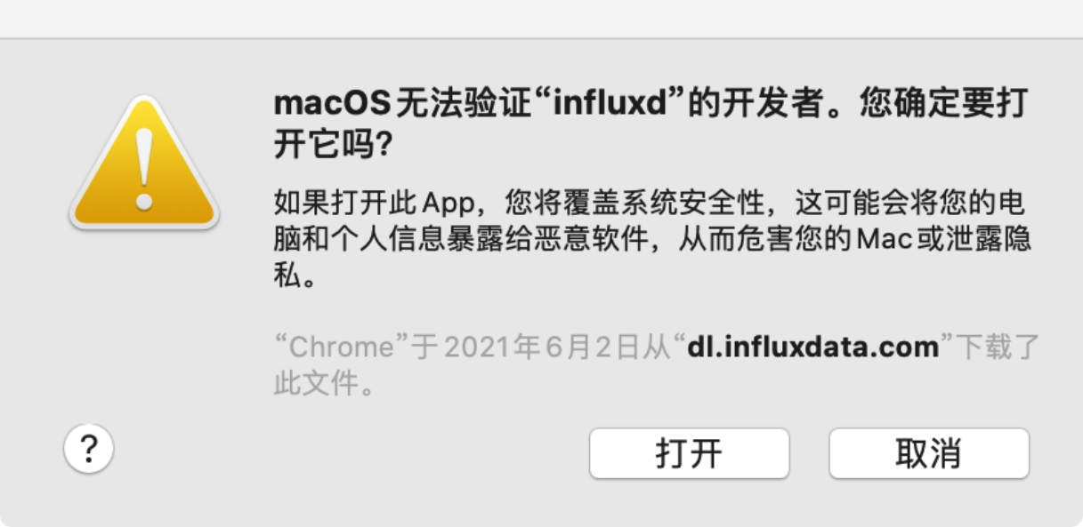 influxd是InfluxDB服务程序,在命令行执行该程序,可能会出现未验证程序无法启动的问题,需要到“安全性与隐私”界面去设置,单击“仍要打开”,程序即可正常打开,如图2-6所示。