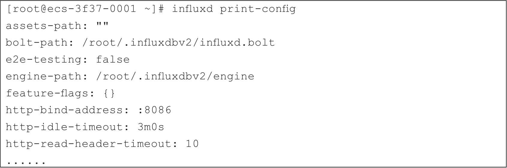 可以通过influxd config > influxd.config导出默认的配置选项,如代码清单2-39所示。