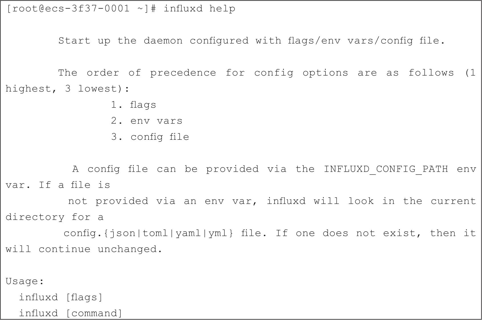 从帮助提示中,可以发现influxd支持两种语法,如代码清单2-32所示。