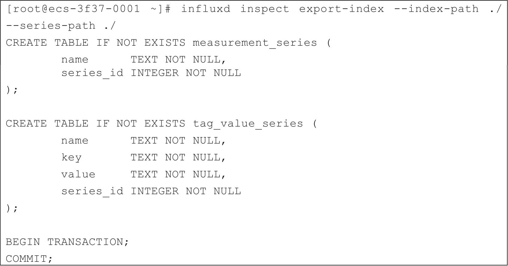 从帮助中可以看出influxd inspect export-index命令可以导出一个TSI索引文件到SQL文件中,便于查看和调试。可以使用influxd inspect export-index --index-path ./--series-path ./命令导出序列文件到当前目录中,如代码清单2-37所示。