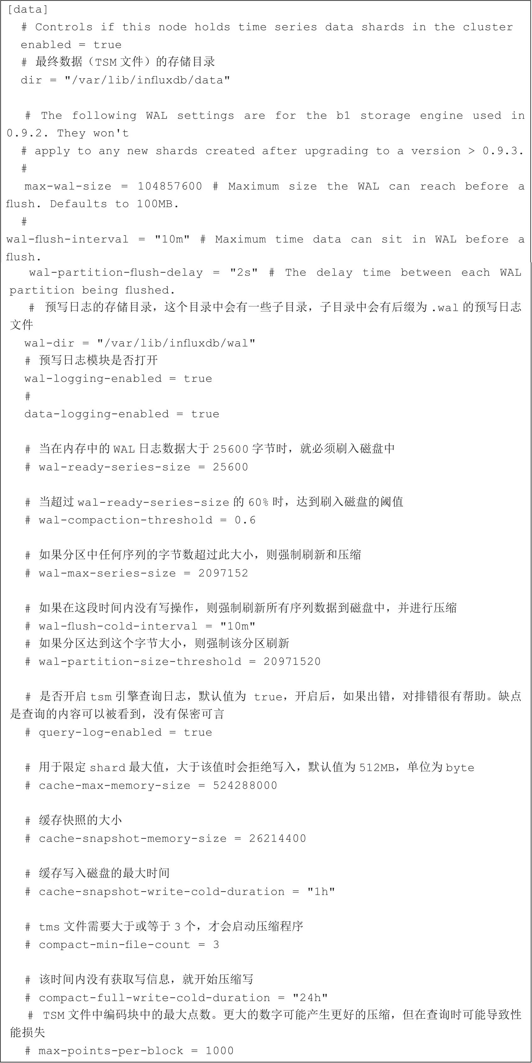 控制InfluxDB的实际分片数据存在的位置以及如何从WAL中刷新数据。“dir”可能需要更改到适合当前系统的位置,但WAL设置是一种高级配置。默认值应该适用于大多数系统。