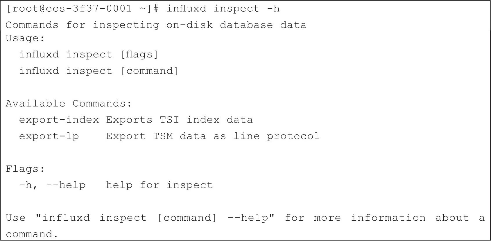 可以通过influxd inspect -h查看influxd inspect命令的具体使用方法,如代码清单2-35所示。