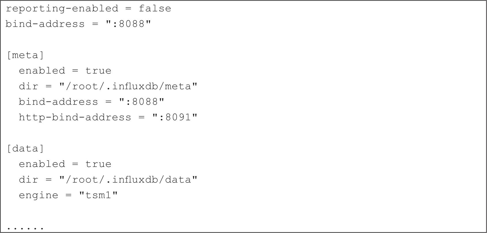打开influxd.config文件,部分配置选项如代码清单2-40所示。