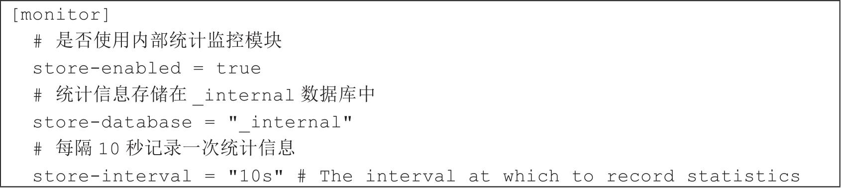 monitor控制InfluxDB自有的监控系统,如代码清单2-46所示。默认情况下,InfluxDB把这些数据写入_internal数据库,如果该库不存在则自动创建。_internal库默认的保留策略是7天。