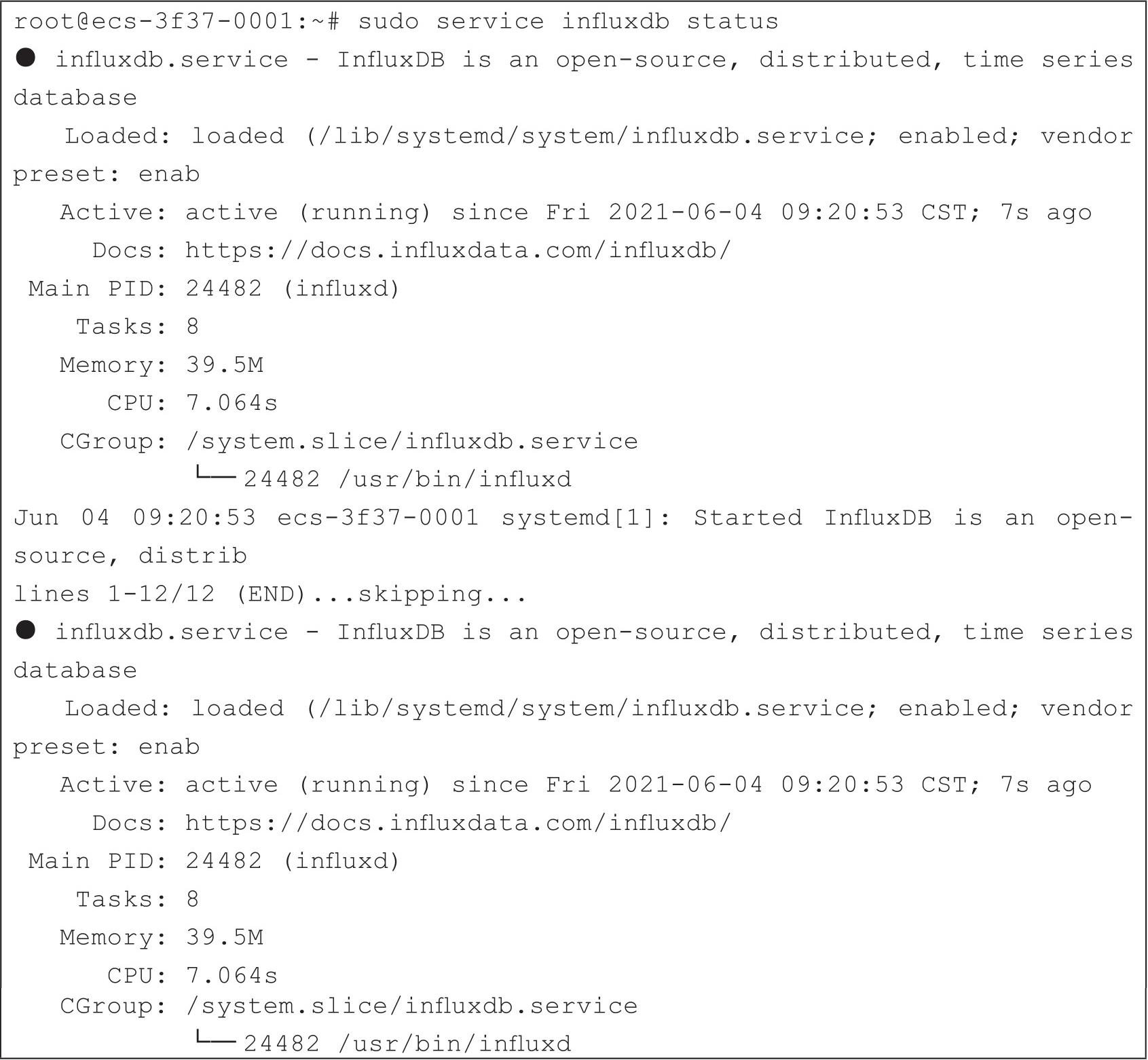 服务启动后,可以通过sudo service influxdb status查看服务状态,如代码清单2-4所示。