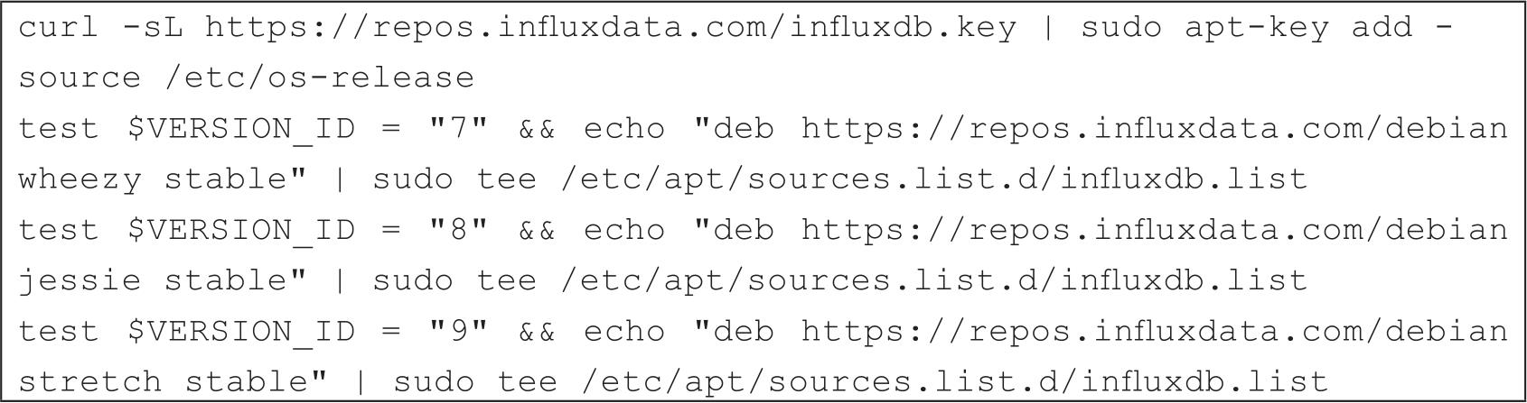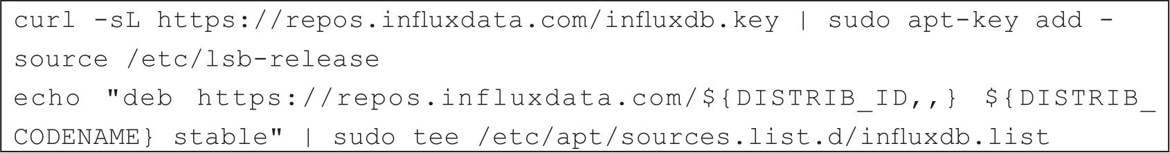 (4)启动InfluxDB。首先,需要将InfluxData软件仓库源添加到Ubuntu & Debian系统中,如果你使用的是Ubuntu系统,可以使用如代码清单2-9所示的方法在Ubuntu中添加软件源。